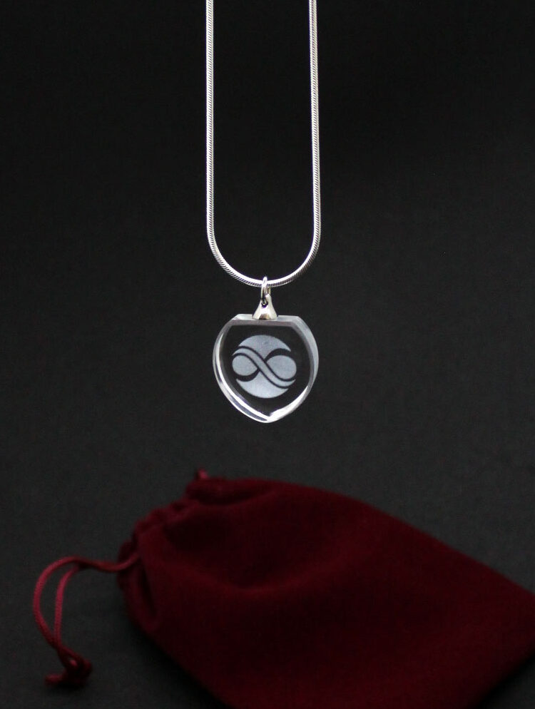 Herzförmiger Schmuckanhänger aus Glas mit einer Silberkette. Der Glasanhänger ist nicht unzerbrechlich.